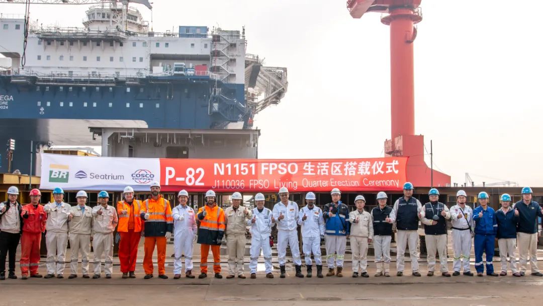 11月16日,啟東中遠海運海工舉行N1151 P-82 FPSO生活區模塊搭載儀式。船東方代表、ABS船級社代表、啟東中遠海運海工項目組成員參加了搭載儀式。