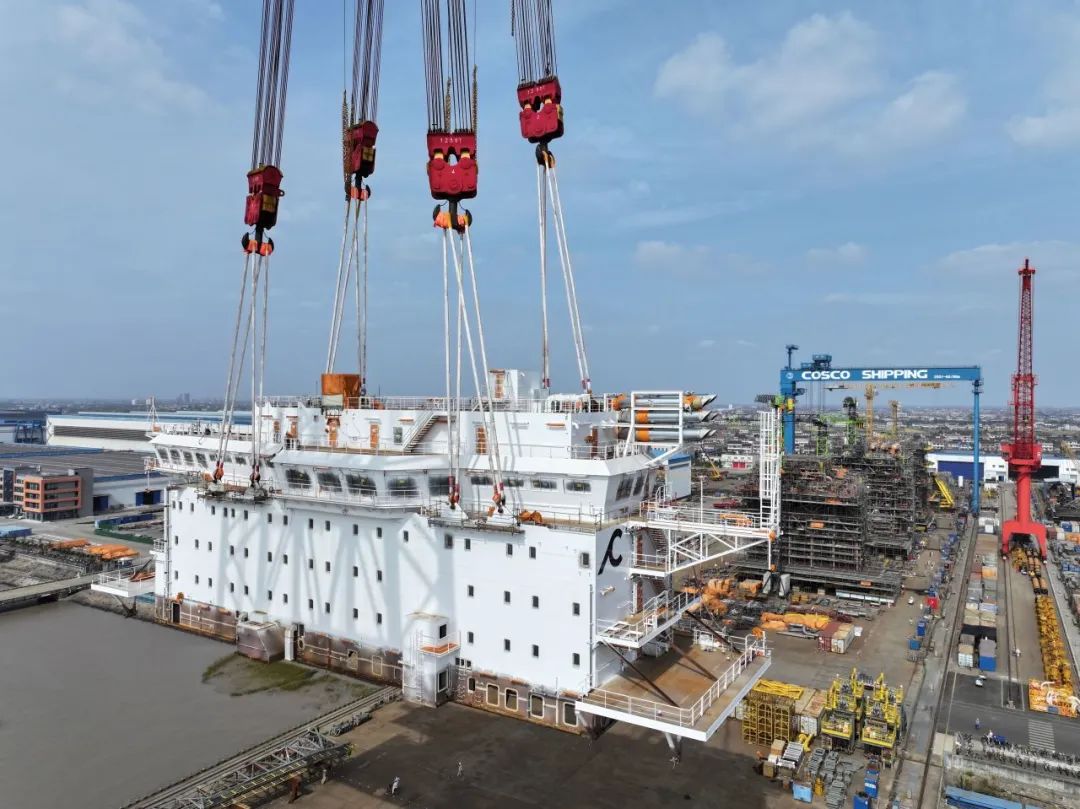 日前,啟東中遠海運海工N1063項目完成生活區完整性吊裝重大節點。從2月中旬至10月底,歷時八個半月,從開始搭載到生活區完整性交付和整體吊裝。是啟東中遠海運海工目前為止海工建造項目周期性最短、完整性最高的生活區項目。