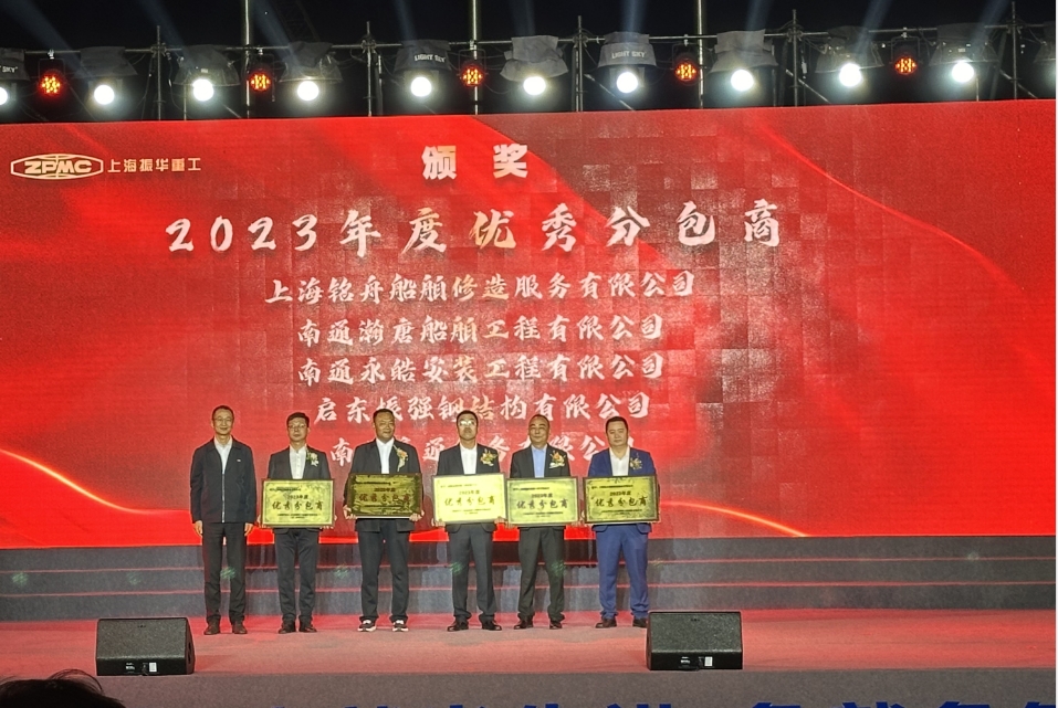 5月8日晚,振華啟東海工成立10周年職工歌詠比賽暨2024年“六比六創·三型一流杯”奪標勞動競賽啟動儀式在公司行政樓廣場隆重舉行。活動中,公司對2023年度“優秀分包商”“優秀項目部”“優秀團隊”“優秀干部”“優秀員工”進行表彰。 南通豪通船務有限公司榮獲2023年度“優秀分包商”稱號。